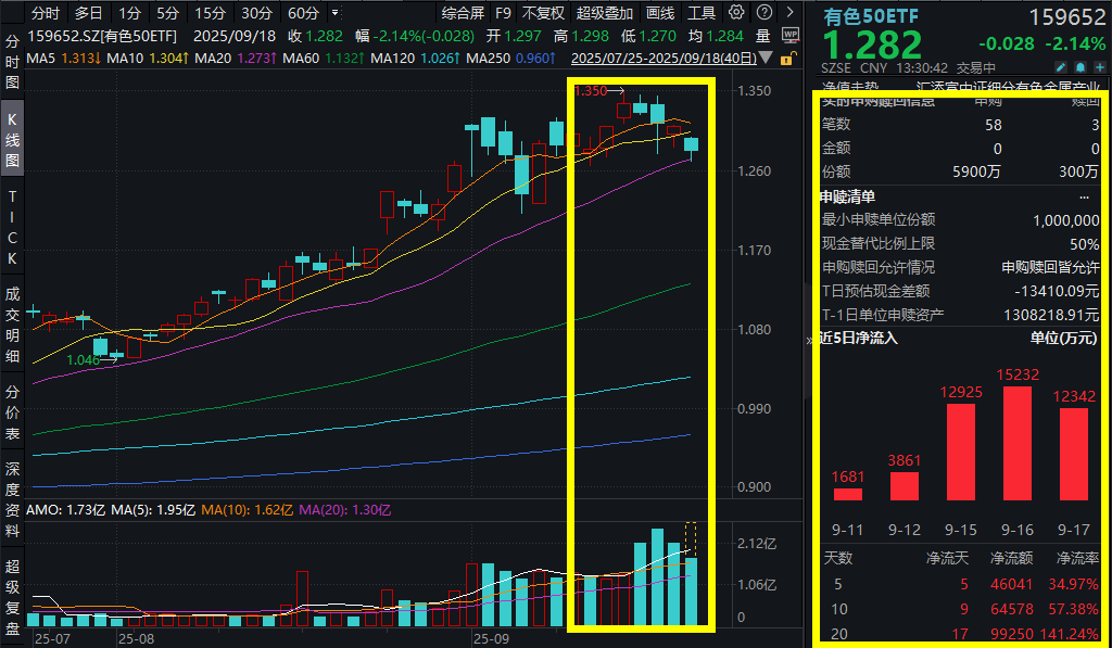 9月18日,降息“靴子落地”后,有色板块回调。截至13:31,有色50ETF(159652)跌2.14%,但资金仍然坚定看好有色板块长期投资价值,盘中净申购超5600万份,按成交均价估算,有色50ETF(159652)实时净申购金额已超7000万元!近20日科技净流入近10亿元,规模在同指数ETF中断层领先!